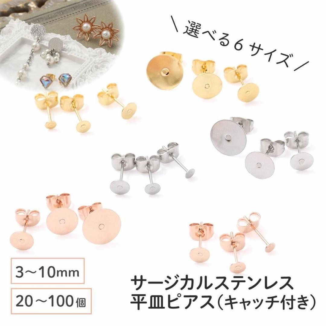 【サージカルステンレス 316 】 平皿ピアス ×八の字キャッチ 3mm 4mm 5mm 6mm 8mm 10mm ゴールド シルバー ピンクゴールド 20個〜100個 台座 丸皿